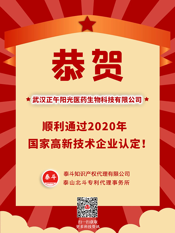 恭賀武漢正午陽光醫(yī)藥生物科技有限公司順利通過2020年國家高新技術(shù)企業(yè)認定!